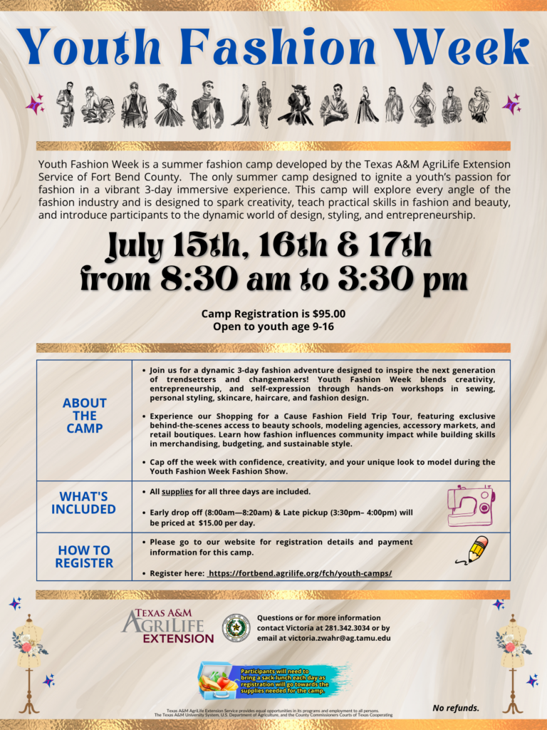Youth in the Fort Bend County and surrounding areas are invited to ignite their passion for fashion at this year’s Youth Fashion Week Experience, a vibrant 3-day immersive experience designed to spark creativity, teach practical skills in fashion and beauty, and introduce participants to the dynamic world of design, styling, and entrepreneurship.